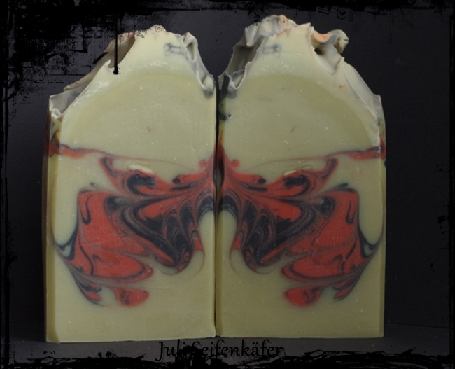 Englisch Rot hell, grüne Öle und Vagone grüne Erde, sowie Kohle sorgen für die Farben und duften tut sie nach Litsea Cubeba, Patchouli und Zitronengras. So lecker frisch
