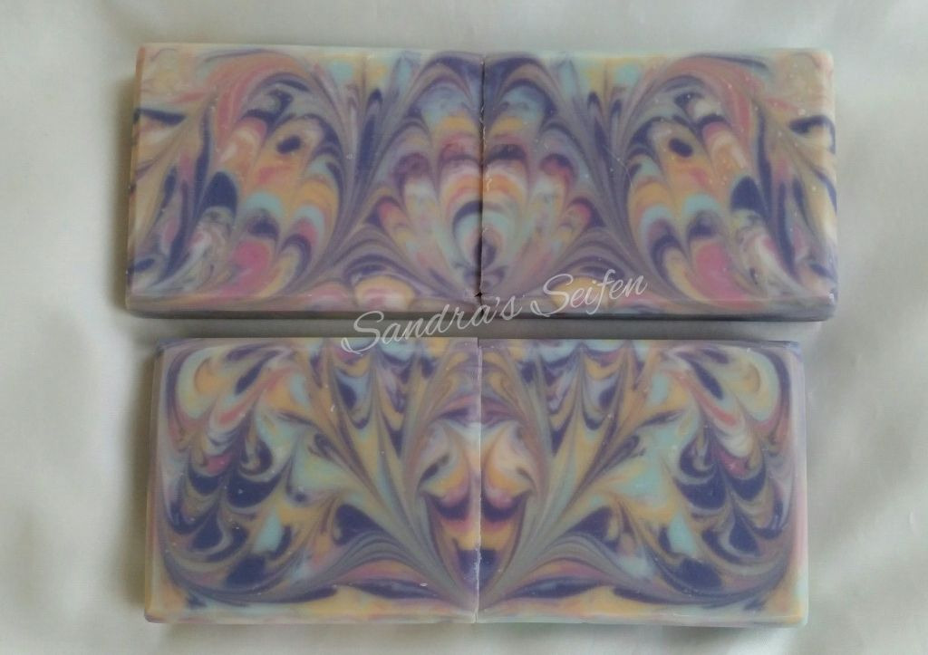 Hier hab ich eine kleinst Charge von 200g geseifelt. Vom Swirl bin ich begeistert, den jedes einzelne Stück für sich ist schön geworden. Diesen Swirl werde ich heute mit einer kleinst Charge und anderen Farben nochmals wiederholen: