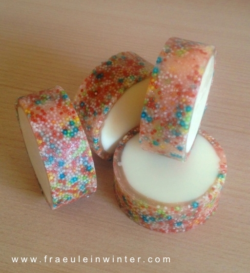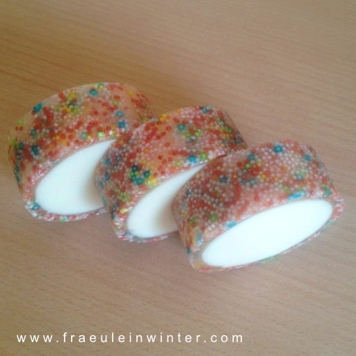 Die Hülle besteht aus gekaufter Glycerinseife (die mit viel weißem und ganz ganz wenig orangem Glitter gefärbt ist) und gaaaanz vielen bunten Zuckerperlen.