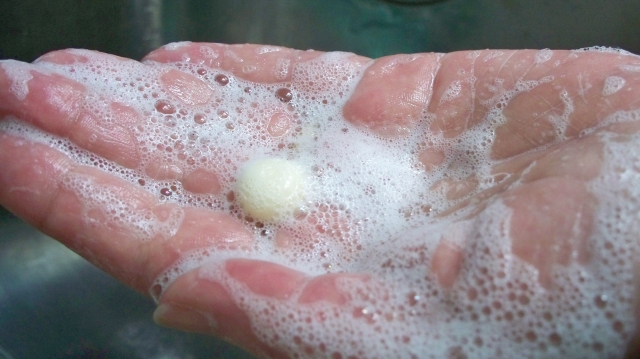 Da ich so neugierig war, wie sich die Seife wäscht, habe ich heute ein Mini-Fitzelchen angewaschen.