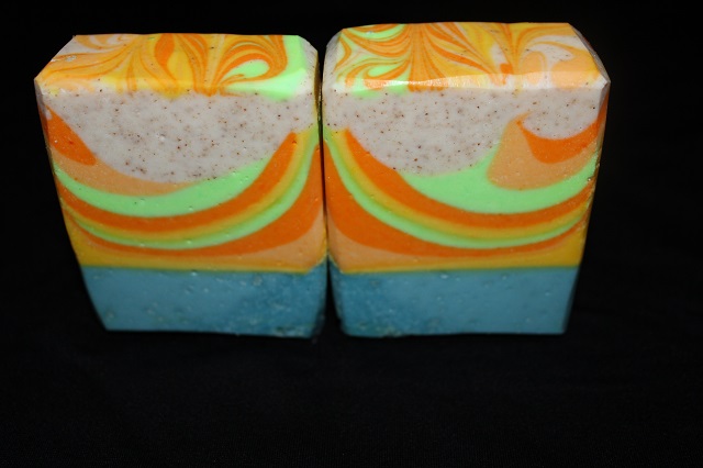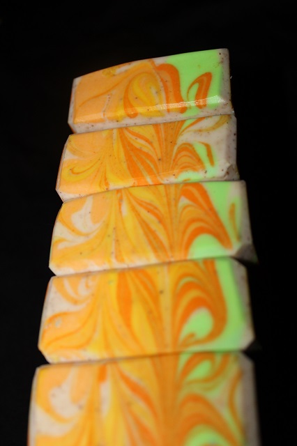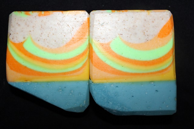 Verseift habe ich Schmalz, Kokos, Reiskeim und Kakaobutter. Außerdem sind gesättigte Sole, Seide und MOG (als Schrubbel im oberen Teil) in die Seife gewandert). Beduftet ist der blaue Teil mit ??? (wie heißt der Beerenduft von den Verseifern K&K, ist für mich weder ausschreibbar noch aussprechbar), der Rest duftet nach Yuzu, die Kombi ist himmlisch, ein bisschen süß, aber frisch und spritzg.
