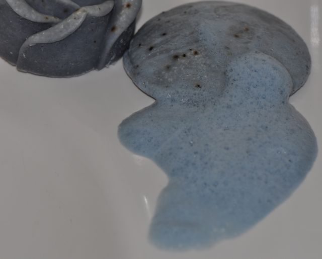 Die Seife hat noch kräftig nachgedunkelt fast in das Schwarze. Beim anwaschen kam eine taubenblaue oder jeansblaue Seife zum Vorschein aber der Schaum ist ebenso kräftig blau, sie blutet heftig aus. Im Hintergrund sieht man zum Vergleich eine von den Rosen nicht angewaschen daneben das Seifenstück mit dem Schaum dazu.