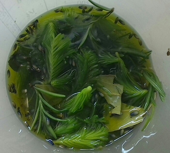 Ich habe aus Lorbeer Maiwipfel Lavendel und Rosmarin einen Heißauszug gemacht.