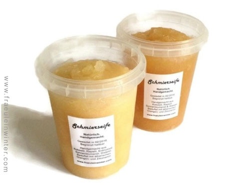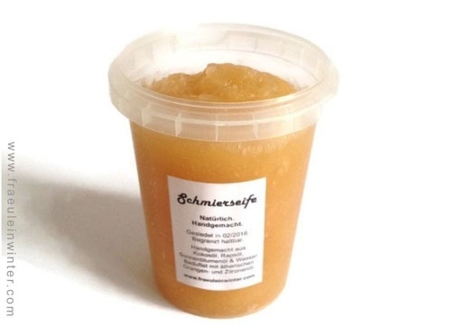 Die Schmierseife ist mit 0% überfettet, besteht aus diversen Ölen, die gerade in Reichweite waren und duftet herrlich frisch nach Orangen und Zitronen.