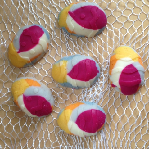 Ich hab das diese Ostern getan, da gabs bei Aldi & Co Maffin-Silikonformen in Ei-Form. Aber halt nur halbe. Die Seifen aus der Form sind mit deinem tollen Marmor-Ei