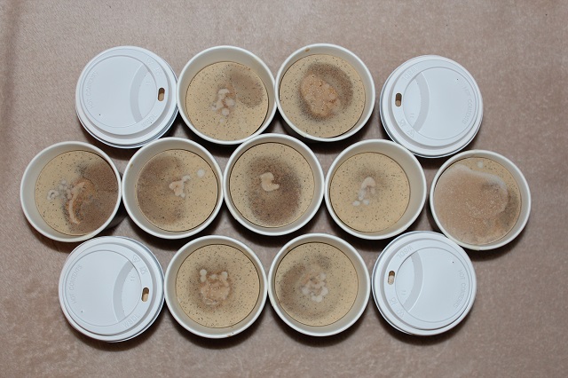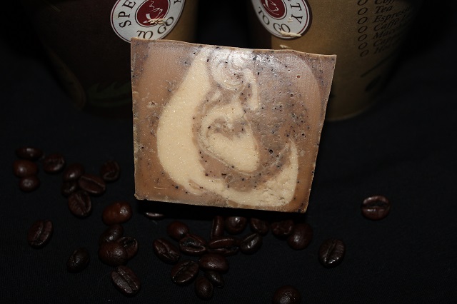 Verseift habe ich Distel HO, Schmalz und Kokos zu je einem Drittel, die Laugenflüssigkeit war gesättigte Sole. Beduftet ist sie mit Roasted Coffee. Den Sl hatte ich in 3 Teile geteilt und mit Löslichem Kaffee zusätzlich, Kaffeepulver und Tio mit Ziegenmilchpulver gemischt und dann nacheinander eingefüllt. Dann kamen die Becher in den ausgeschalteten 50C vorgeheizten Backofen und blieben dort unabgedeckt über Nacht. Auf die tolle, passende Sodaasche bin ich total stolz, sie lässt den Kaffee noch echter erscheinen (dass ich das mal sage, hätte ich auch nicht gedacht).
