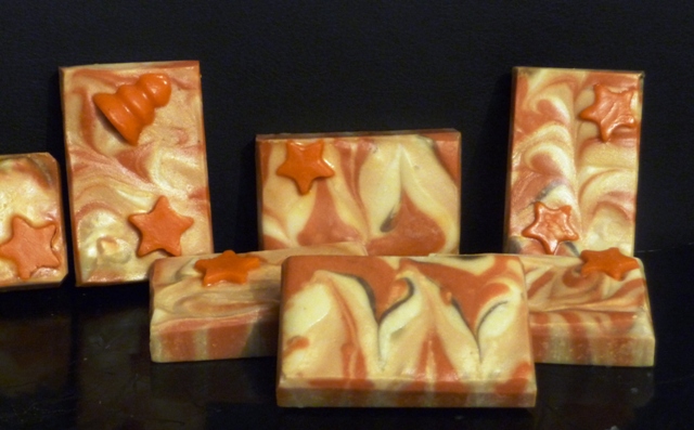 Diese Seife hat mich sowas von überrascht und glücklich gemacht, dass ich sie unbedingt hier zeigen möchte. Eigentlich wollte ich nur eine einfach geswirlte Seife mit Sternchen-Aufleger machen. In den Grundseifenleim hatte ich wild vier Farben gegossen (blütenorange, gold Mica, schwarz und tio. und ein bisschen herumgeswirlt. Weil es mir aber nicht gefallen hat, habe ich darüber wieder Grundseifenleim gegossen, und dann brav den Zigzag-Swirl gezogen und die Sternchchen draufgedrückt, so: