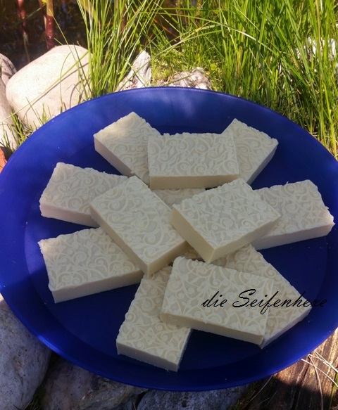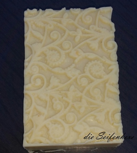 In den Divi hatte ich vor dem Einfüllen eine Relief-Backmatte gelegt, und zum Glück ist die Seife schon nach 5 Stunden so hart gewesen, dass ich sie, ohne das Muster zu beschädigen ausformen konnte.